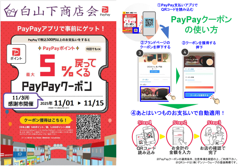 2025年11月1日(土)〜11月15日(土)の期間、白山下商店会 × PayPay 感謝市コラボ 5%還元キャンペーンを実施します!